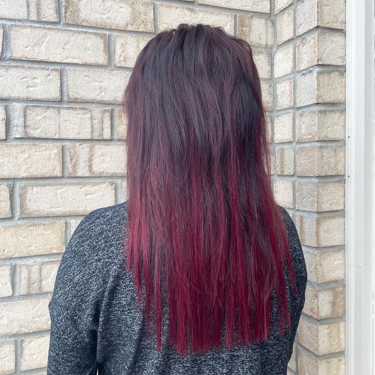 This color is absolutely stunning in person. In regular lighting it’s deep in color just as seen online. Then in direct sunlight the color pops with a reflective shine without being a warm red. I decided to pair the J99 with a set of 1N hand tied wefts to give the client length with a pop of color to mimic a balayage look without coloring her natural hair! The results were exactly what we were hoping for! Perfection.